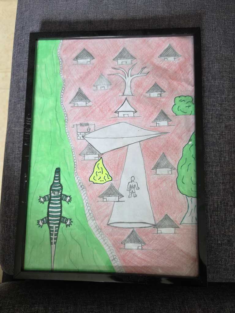 - Le tableau de l’artiste cap-verdien César Augusto, art naïf, crayons, réalisé en octobre 2025, exposé à Busy et Pont Sainte-Marie. Dimension standard. Valeur 20 euros.